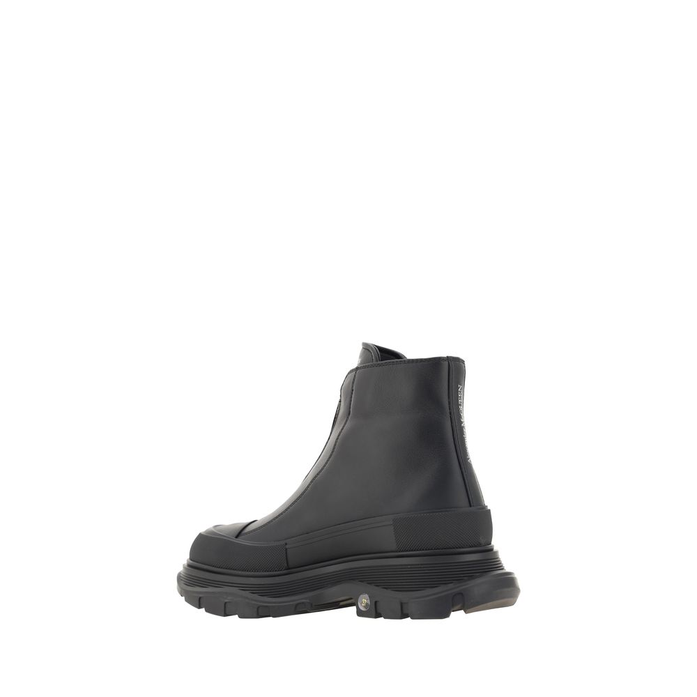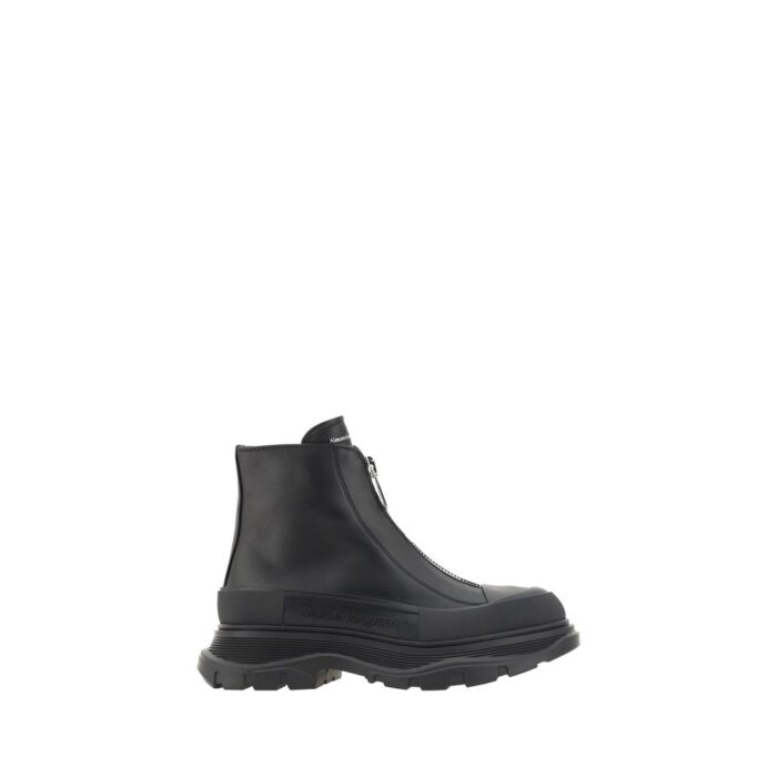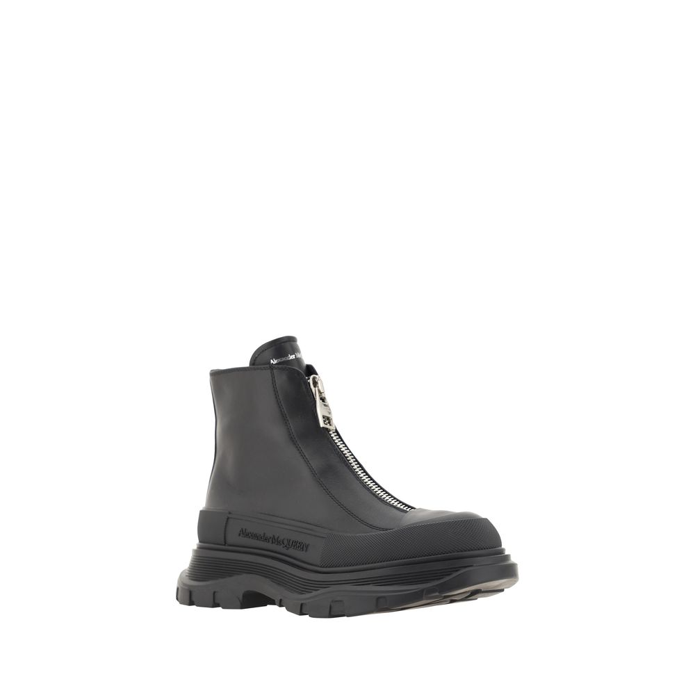 Calfskin Ankle Boots by Alexander McQueen, round structured toe, ankle model, front zip closure, platform structured sole, iconic brand monogram in contrast on the heel.