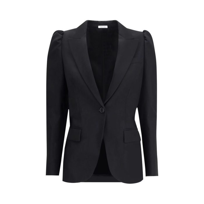 The Black single-breasted Jacket by Alexander Mcqueen reimagines classic elegance with a contemporary twist. Traditional lapels, a chest pocket, and two flap side pockets create clean, sophisticated lines, while the single-button closure accentuates the sleek silhouette, making it perfect for modern, refined outfits