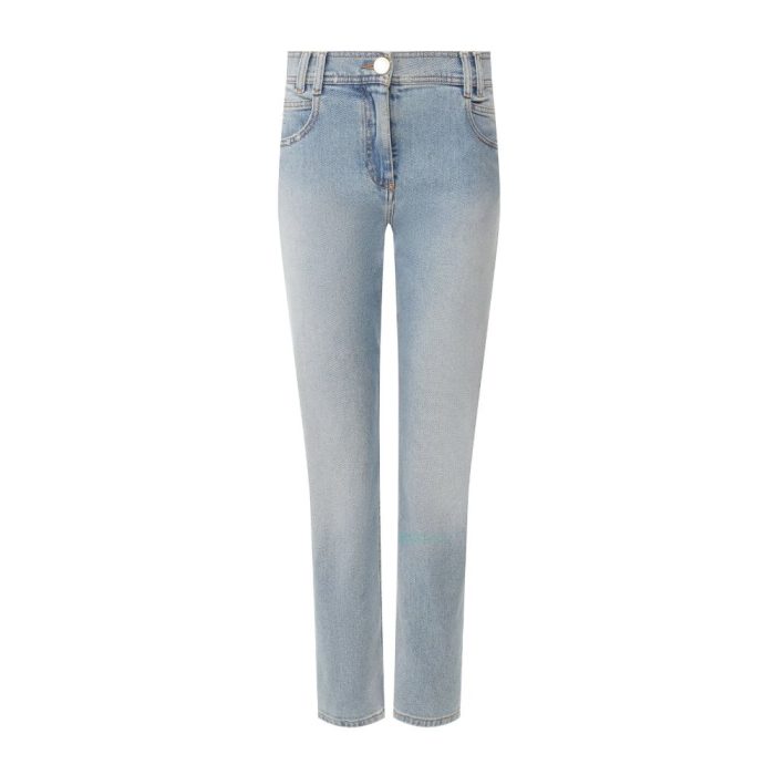 Balmain washed blue cotton regular jeans, six pockets, button and zipper fly, belt loops, embroidered logo on back pocket