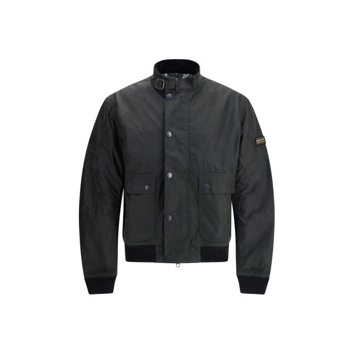 The Traction Wax Jacket by Barbour International is crafted in sage waxed Cotton, offering a durable and timeless style. It features a collar with throat latch, front zip and snap-button closure, flap patch pockets, and the iconic logo on the left sleeve. Ribbed cuffs and hem complete the design, while the padded lining ensures warmth and comfort during colder months