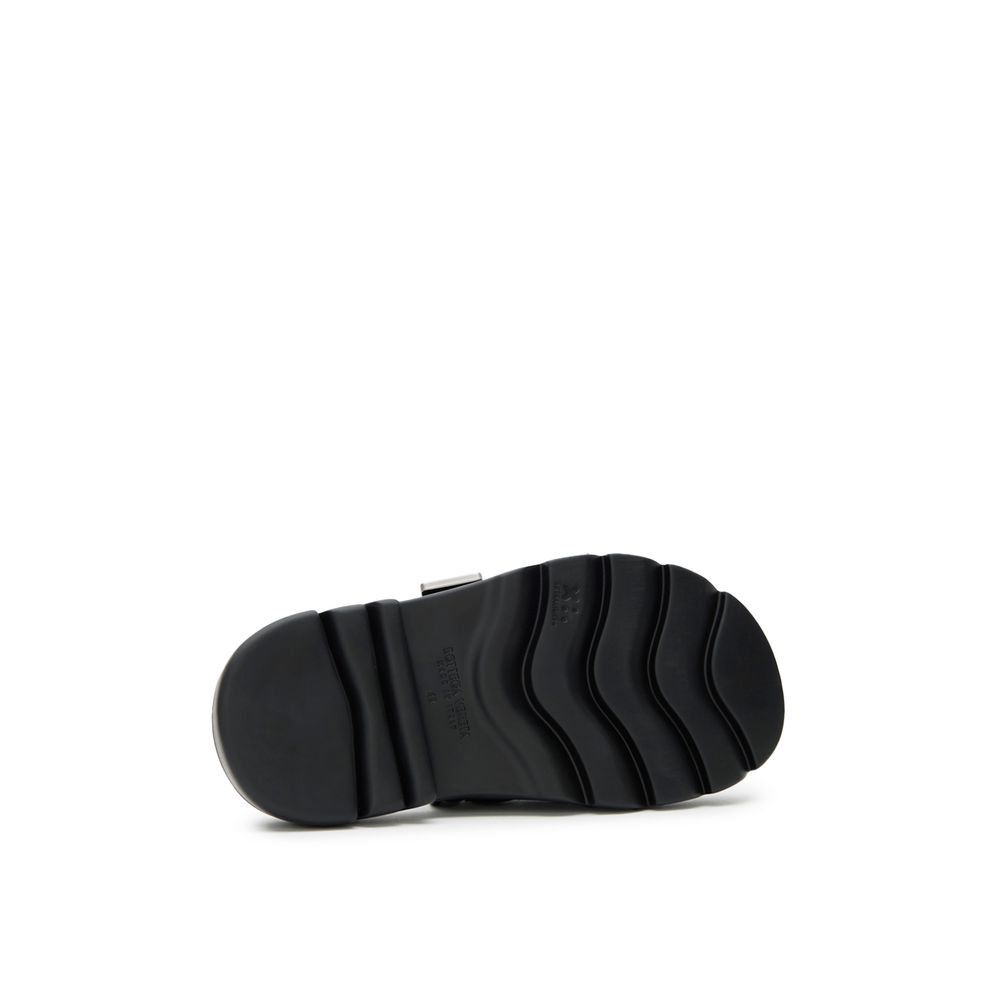 Round toe, leather insole and trim, wide strap with two Velcro straps, satin-finish metal details. Rubber lug outsole.