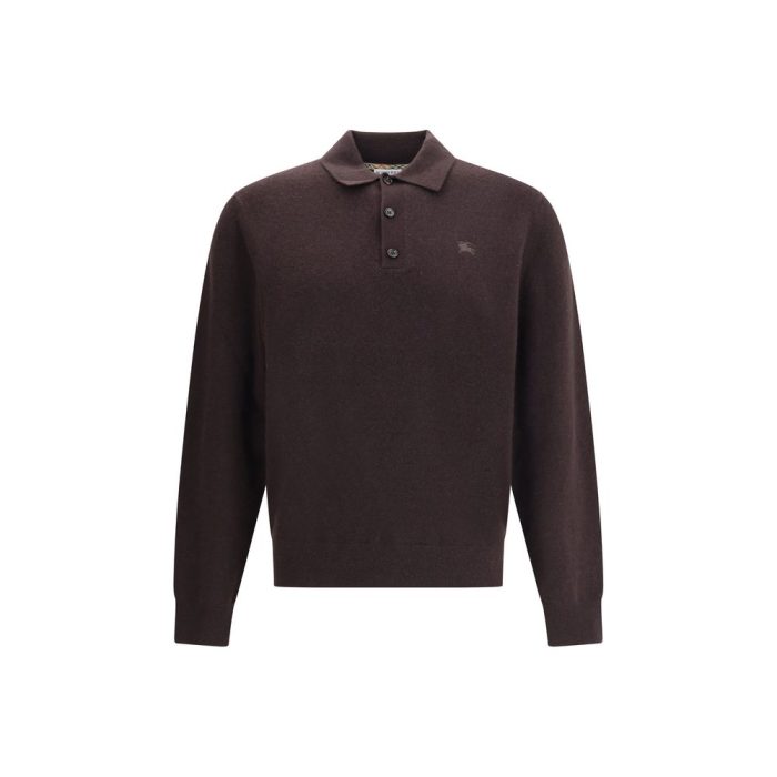 Burberry’s cashmere long-sleeved polo sweater is a garment that combines the softness of fine yarn with the house’s iconic details. Made from pure cashmere, it offers a comfortable fit and a luxurious feel against the skin. The design features a classic button placket and ribbed trim on the collar, cuffs and hem for a defined yet relaxed silhouette. The embroidered Equestrian Knight Design, Burberry’s historic symbol, stands out on the chest, adding a distinctive and refined touch. A versatile and timeless garment, perfect for everyday elegance.