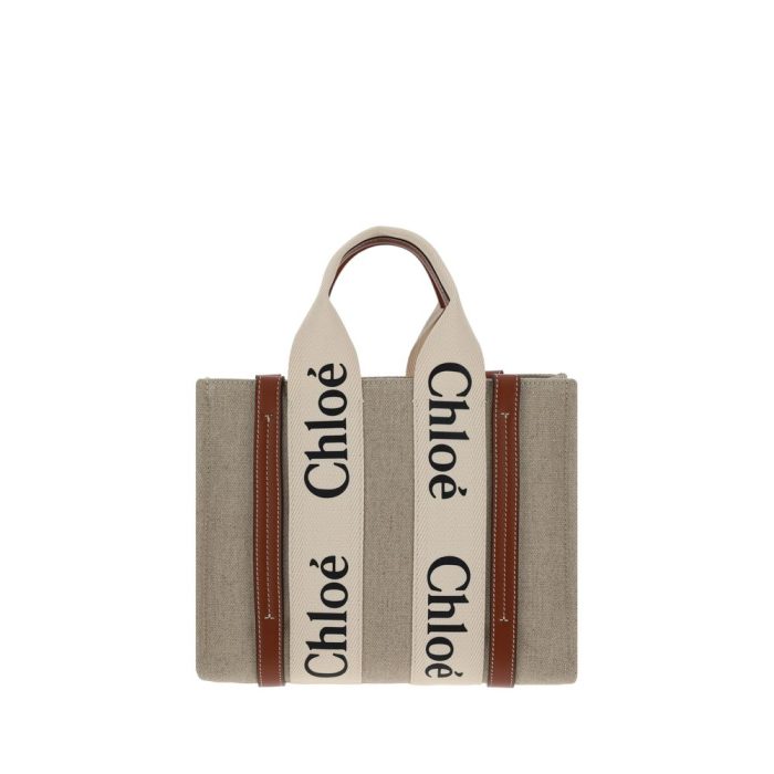 Canvas Woody Handbag by Chloé, two flat top handles, removable and adjustable flat leather shoulder strap, bands on front and back with contrasting iconic brand monogram, interior flat pocket, leather trim.