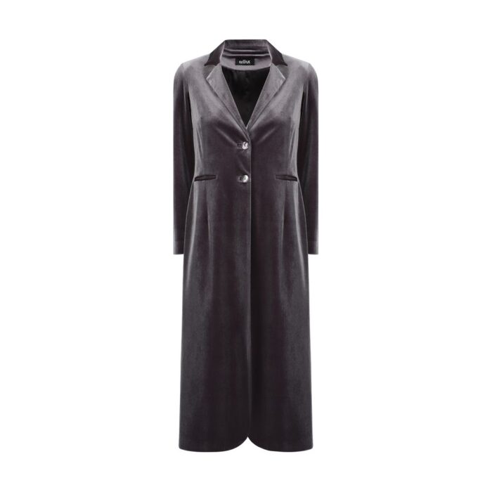 Long Jacket by Ella, velvet design, contrasting front button closure, classic lapels, two front welt pockets, back slit, regular fit.