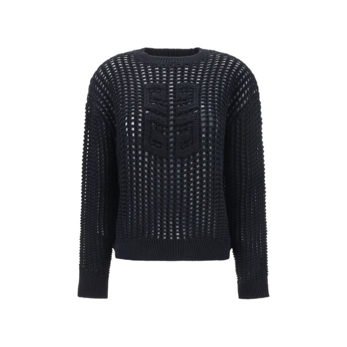 Wool and Cashmere Sweater by Givenchy, quilted knit texture, contrasting iconic 4G logo on front, ribbed crew neck, ribbed flared hem, extra long sleeves with ribbed cuffs.