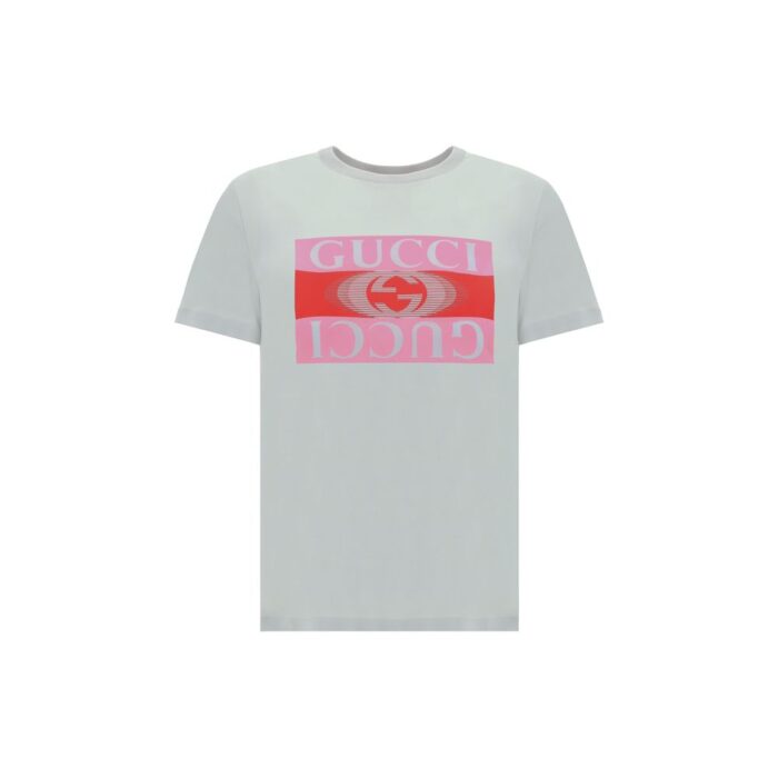 Cotton New 70s T-Shirt by Gucci, featuring ribbed crew neck, iconic brand monogram contrasting on front, monochrome pattern, regular fit.