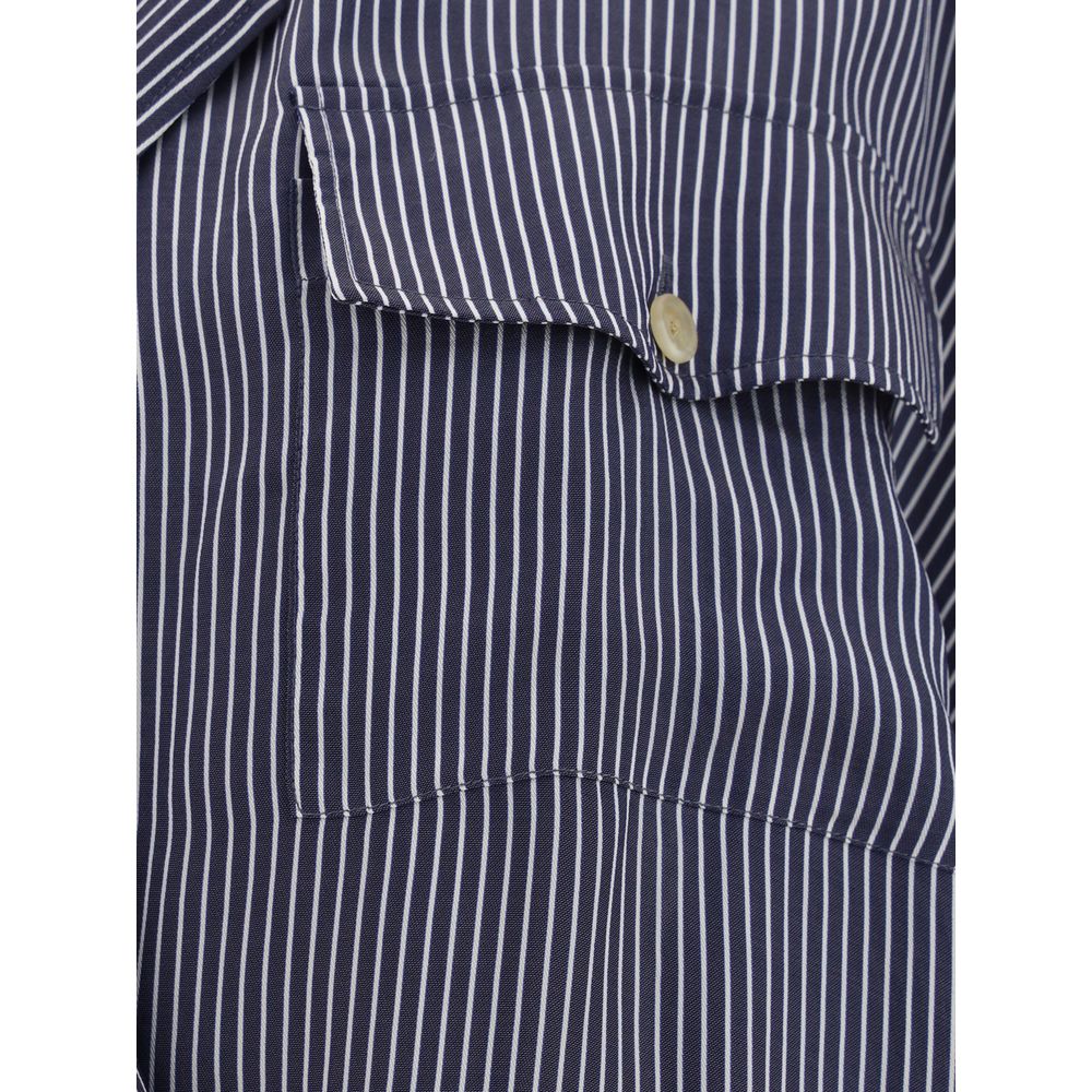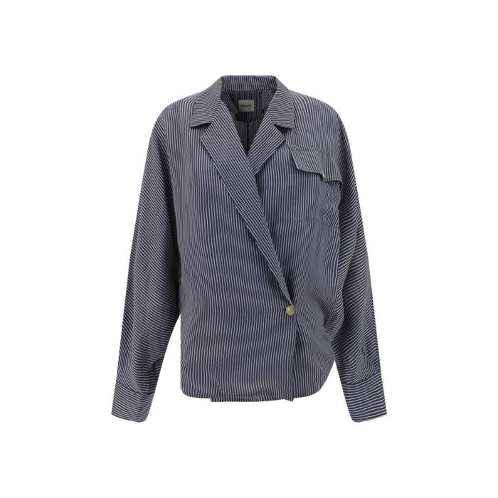 Garth Shirt by Khaite, classic lapels, deep V-neck front, asymmetrical button front closure, adjustable button cuffs, front patch flap pocket, pinstripe design, regular fit.