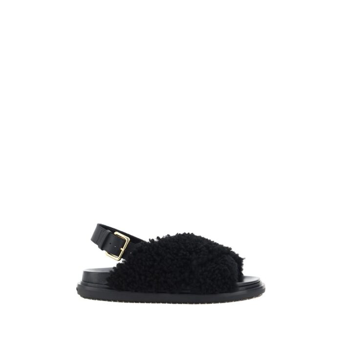Leather Fussbett Sandals by Marni featuring a knurled flat sole, an open toe on the front, fur detail on the upper, an adjustable buckle closure at the back of the foot, a logo-embossed insole.