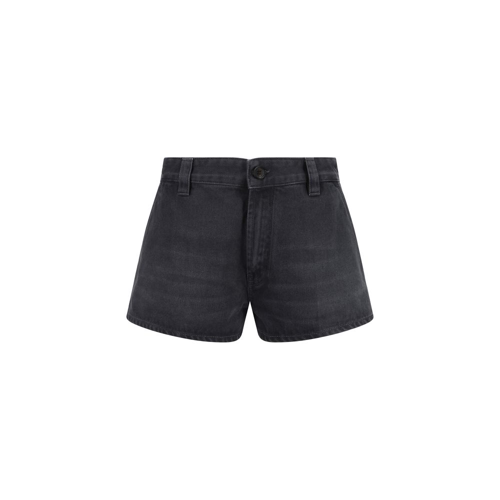 Cotton Denim Shorts by Miu Miu, front zipper and button closure, two side welt pockets, two patch back slit pockets with iconic brand monogram detail , waistband loops, monochrome pattern, regular fit.