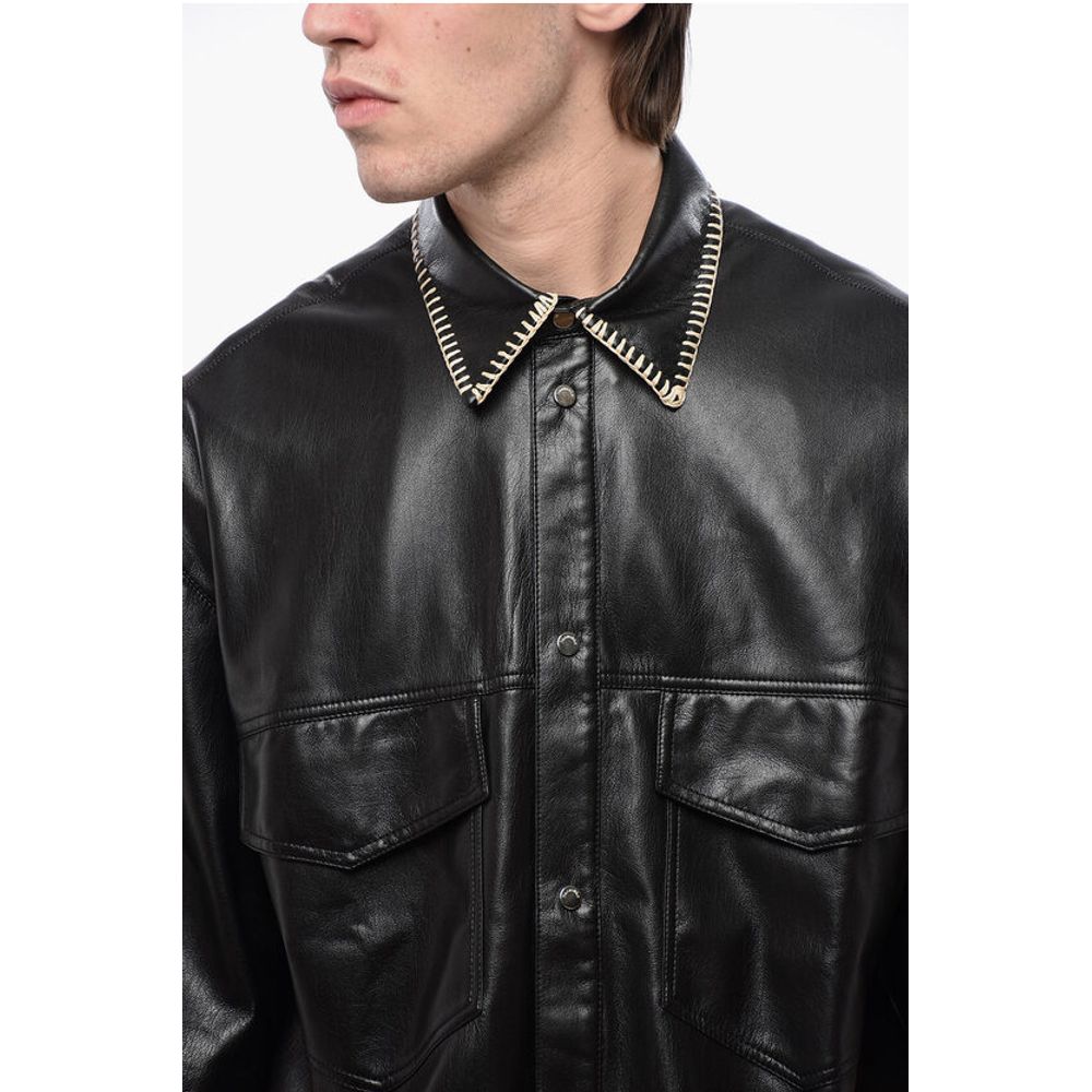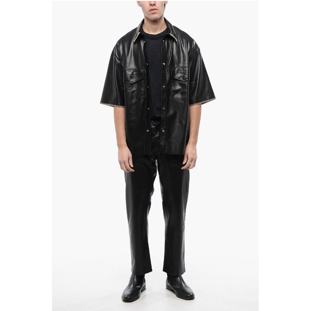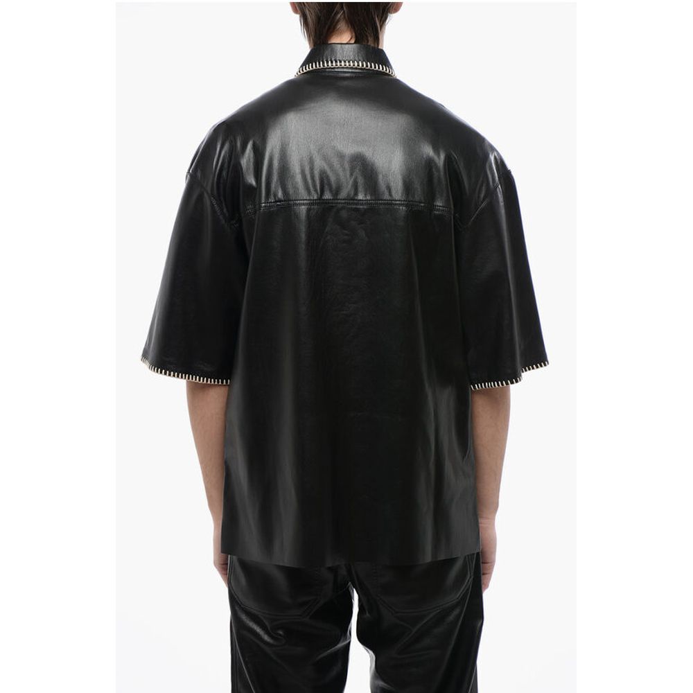 Nanushka Short Sleeved Faux Leather Shirt with Raffia Stitching