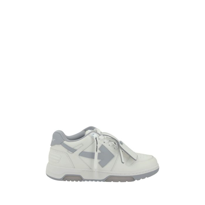 Leather Out Of Office Sneakers by Off-White feature a lace-up front closure and a round toe. The side panels are decorated with the brand’s iconic Arrow logo, while the flat sole ensures comfort. A distinctive detail is the applied zipper tie tag on the front, accompanied by the contrasting logo on the heel, giving it an urban and contemporary feel.