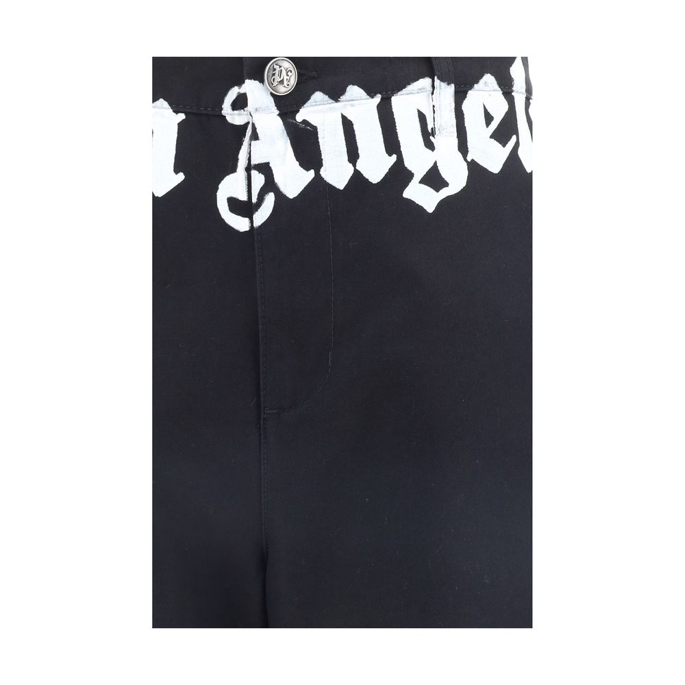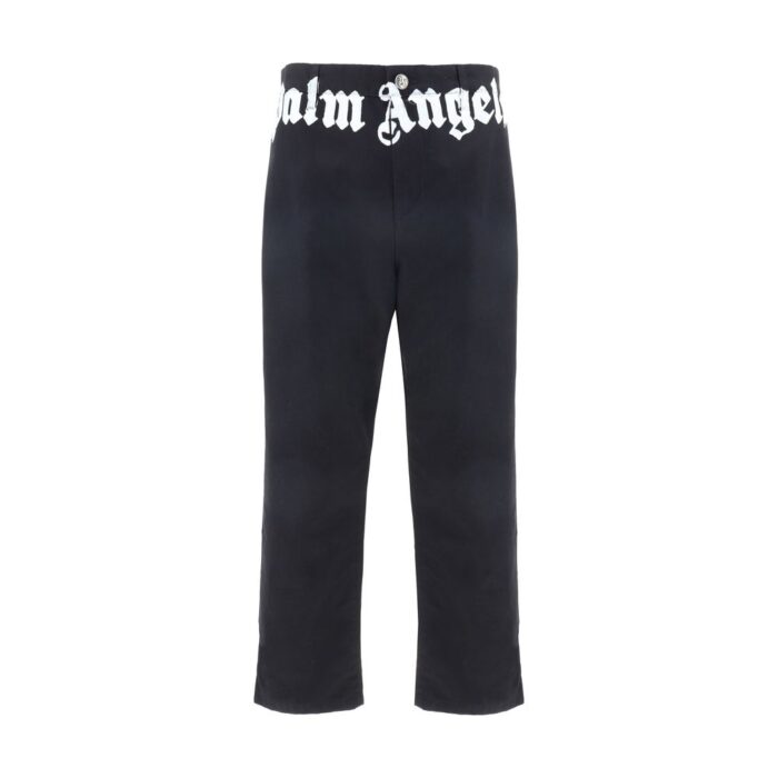 Cotton Pants by Palm Angels, front button and zipper closure, two side slash pockets, two back welt pockets, waistband loops, contrasting iconic brand monogram on front, regular fit.