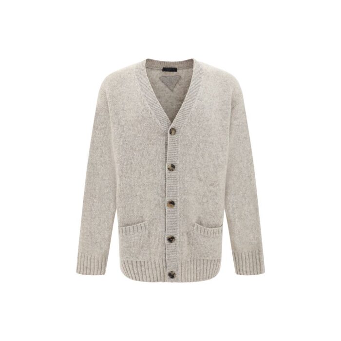 Cashmere Cardigan by Prada, featuring front button closure, ribbed cuffs, V-neck with ribbed trim, ribbed hem, two welt patch pockets on front, mélange pattern, regular fit.