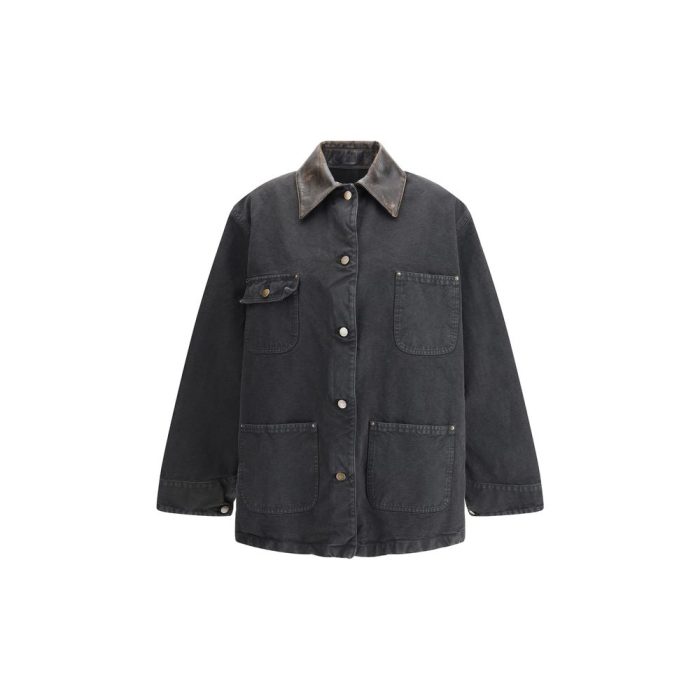 Prada’s oversized denim Jacket is a garment with a bold and contemporary character. It features a distressed leather collar that adds a touch of grit and originality to the design. The front button closure ensures a classic fit, while the four pockets on the front – including two with flaps and buttons – combine functionality and aesthetics. On the back stands out the iconic triangular leather patch, the brand’s hallmark that stylishly completes this versatile and trendy jacket.