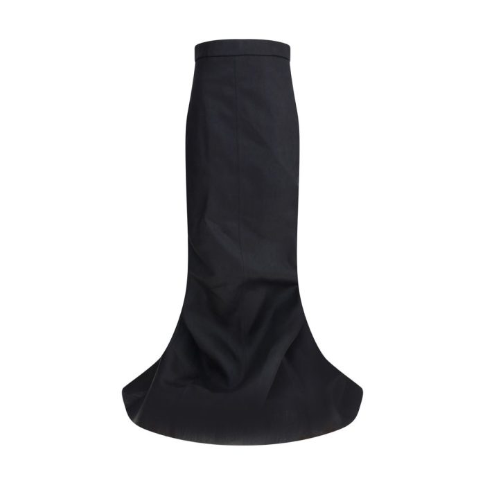 Rick Owens’ Lido Long Skirt is a sharply styled, minimalist piece that enhances the silhouette with an essential pencil design. Featuring two side welt pockets and a back zipper closure, it is distinguished by an asymmetrical raw-cut hem and back slit, elements that add movement and a distinctive touch to the brand’s bold aesthetic.