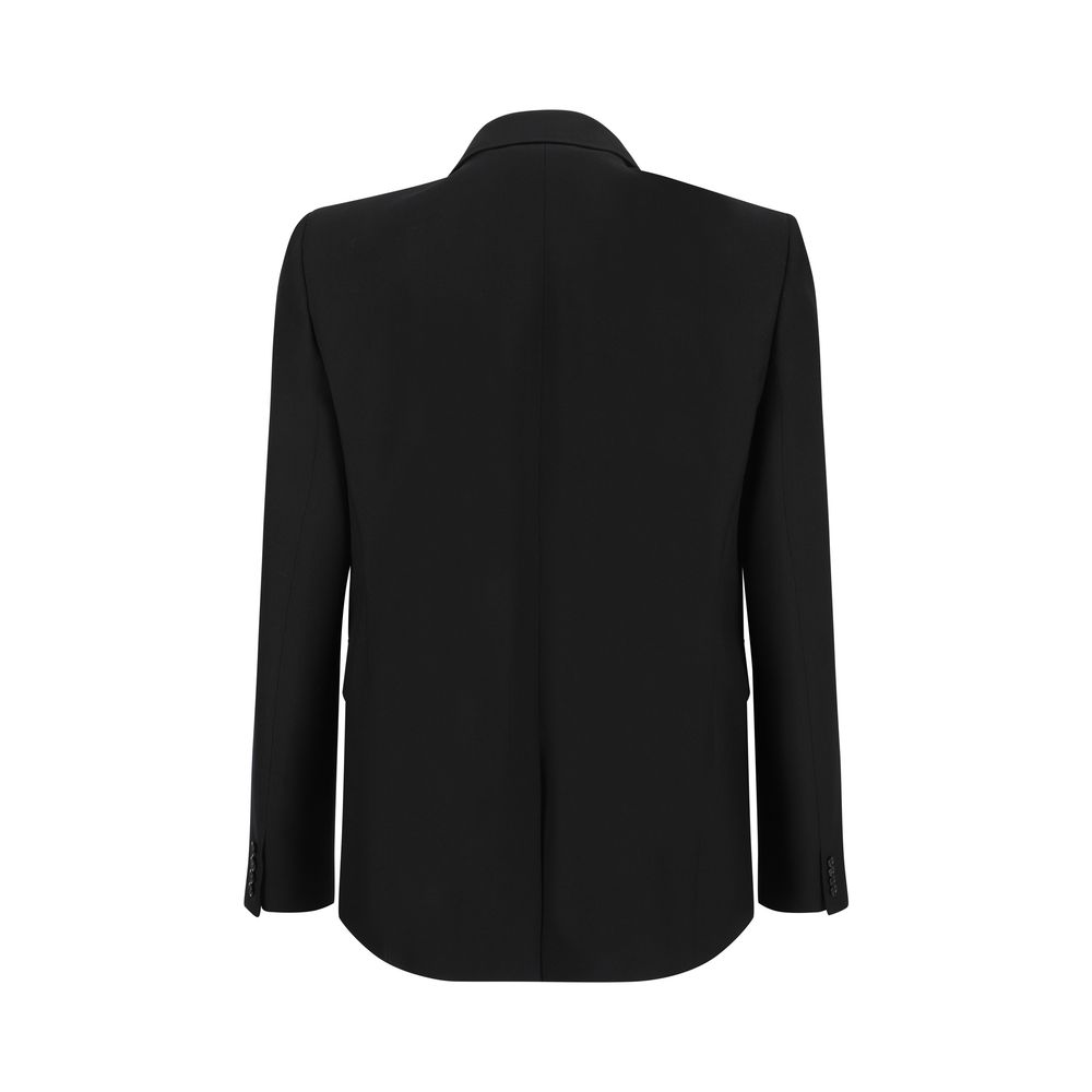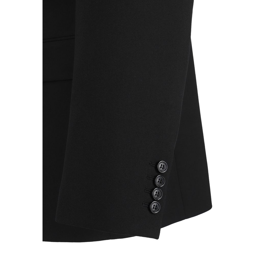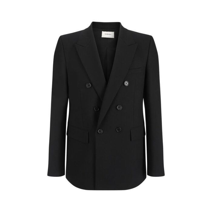 Wool Blazer Jacket by Saint Laurent featuring a double-breasted front closure with contrasting buttons, peaked lapels, two welt pockets with side flaps, a front welt pocket, a back vent, structured shoulders, and a regular fit.
