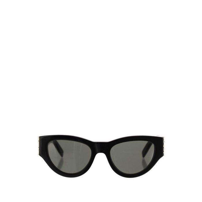 The Saint Laurent Cat-Eye Sunglasses are an elegant and bold accessory that combines a touch of vintage glamour with a contemporary style. The cat-eye shape, with its thin lines and raised sides, gives a feminine and sophisticated look, perfect for those looking for a distinctive and refined look. The iconic gold logo, applied on the side, adds a luxurious and recognizable detail, recalling the timeless elegance of the brand.