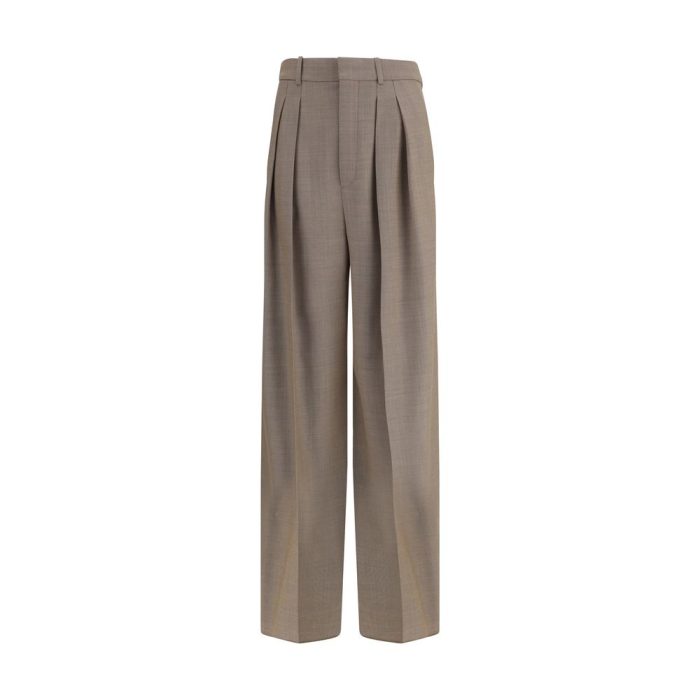 Saint Laurent’s wide leg Pants, made from wool, are distinguished by a sleek, structured silhouette. Featuring a center pleat and double pleats, they have a high waist with belt loops, front zipper and hook-and-eye closure. Two side welt pockets and two buttoned back pockets complete the design for timeless sartorial elegance.