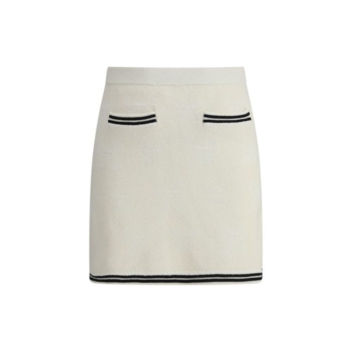Self-Portrait’s Mini Skirt is a sleek, modern piece designed for a refined, feminine look. The elasticized waistband ensures comfort and a perfect fit. The jacquard weave with all-over repeated tone-on-tone bow adds a touch of understated elegance, while the contrasting hemline lends a distinctive and dynamic detail. The two welt pockets on the front complete the design, combining functionality and style.