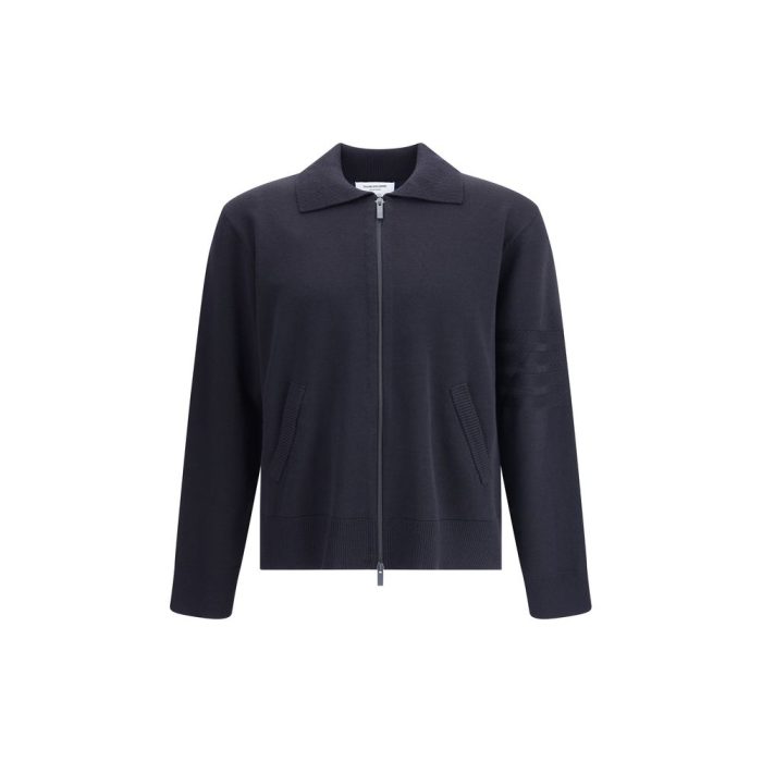 Virgin wool Cardigan by Thom Browne features a classic collar and front zipper closure for practical, modern comfort. The design features two side welt pockets and ribbed cuffs and hem for a detail-oriented finish. The iconic tone-on-tone horizontal band on the left sleeve adds a distinctive and recognizable touch to the garment. Perfect for those seeking a balance between elegance and contemporary casual style.