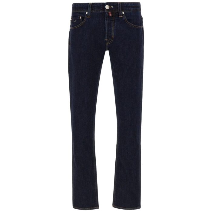 Tramarossa dark blue jeans of high tailoring in slightly stretch cotton, regular fit, five-pocket model, blue suede patch with metal logo on the back