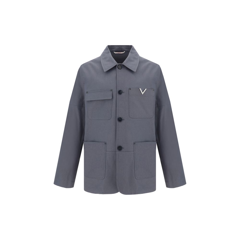 Cotton Caban Jacket by Valentino, featuring classic collar, front button closure, adjustable button cuffs, front patch welt pockets, three-dimensional VLogo detail applied to front pocket, monochrome pattern, regular fit.