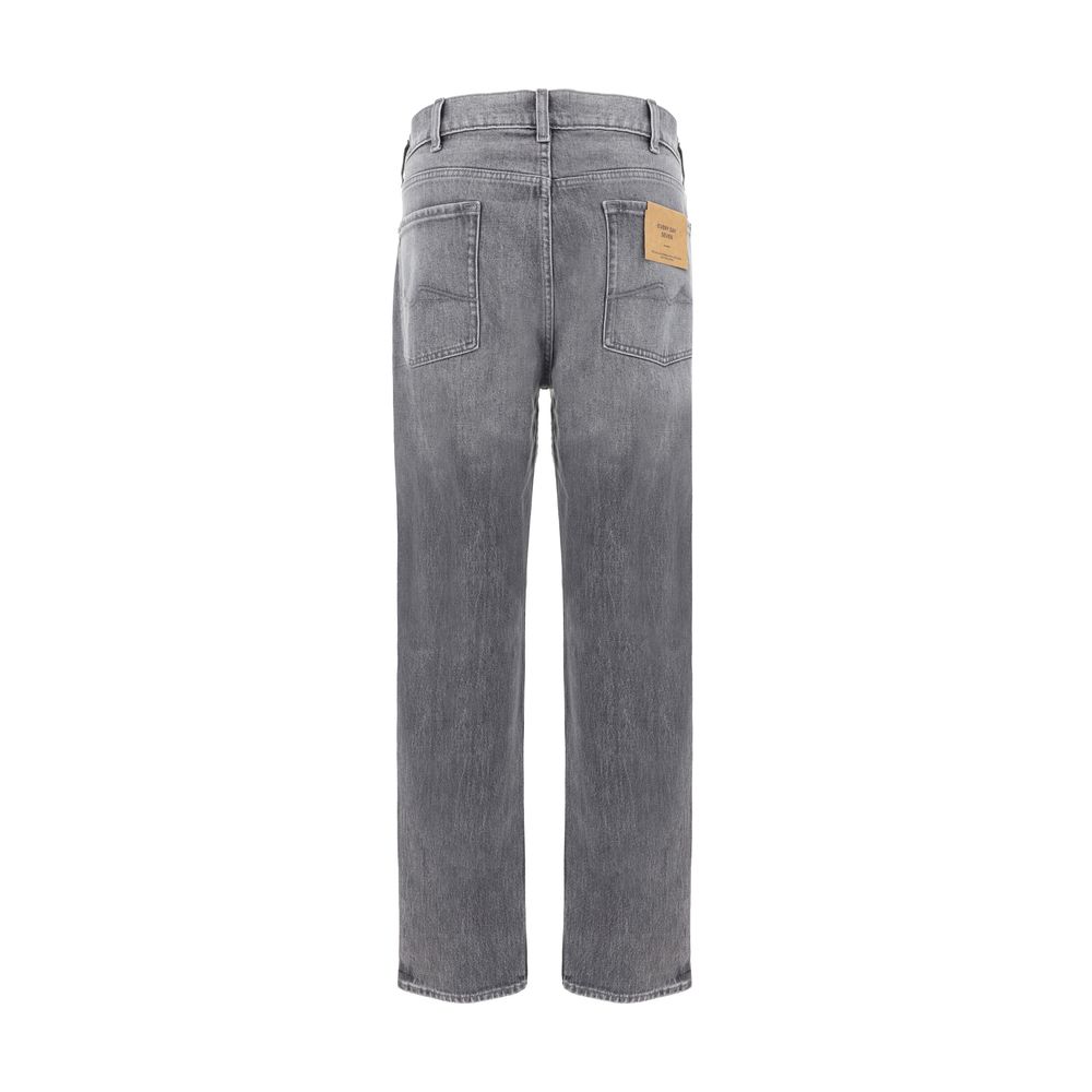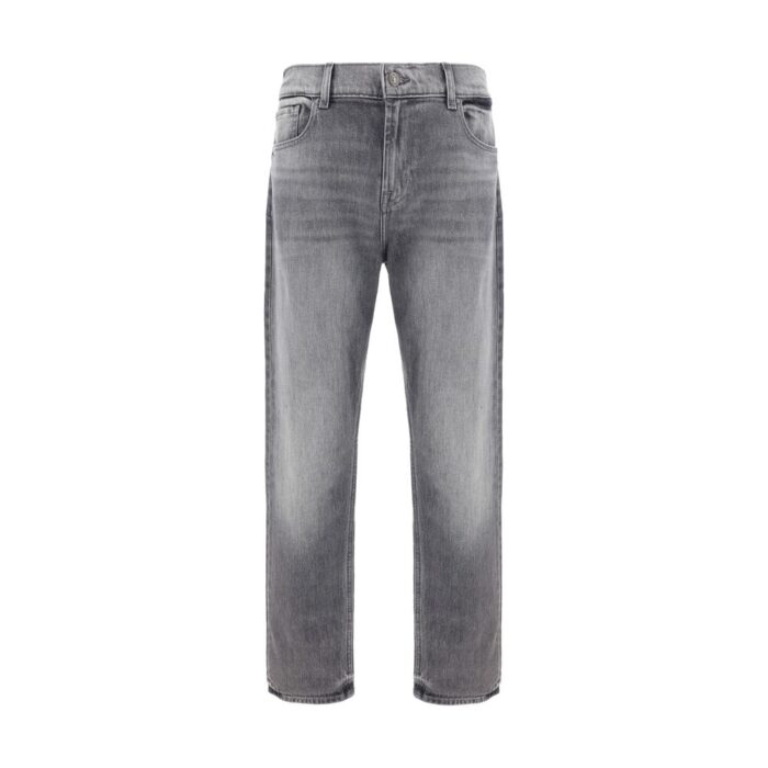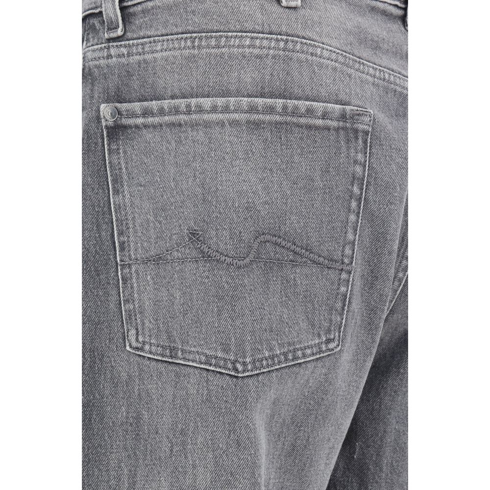 Cotton Check Off Jeans by 7For, five-pocket straight style, front button and zipper closure, belt loops waistband, iconic leather patch with brand signature pressure-printed applique on back.