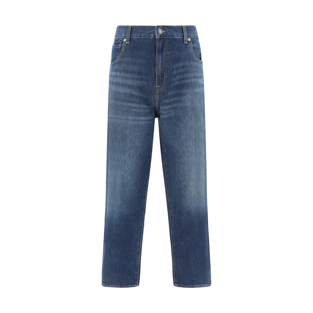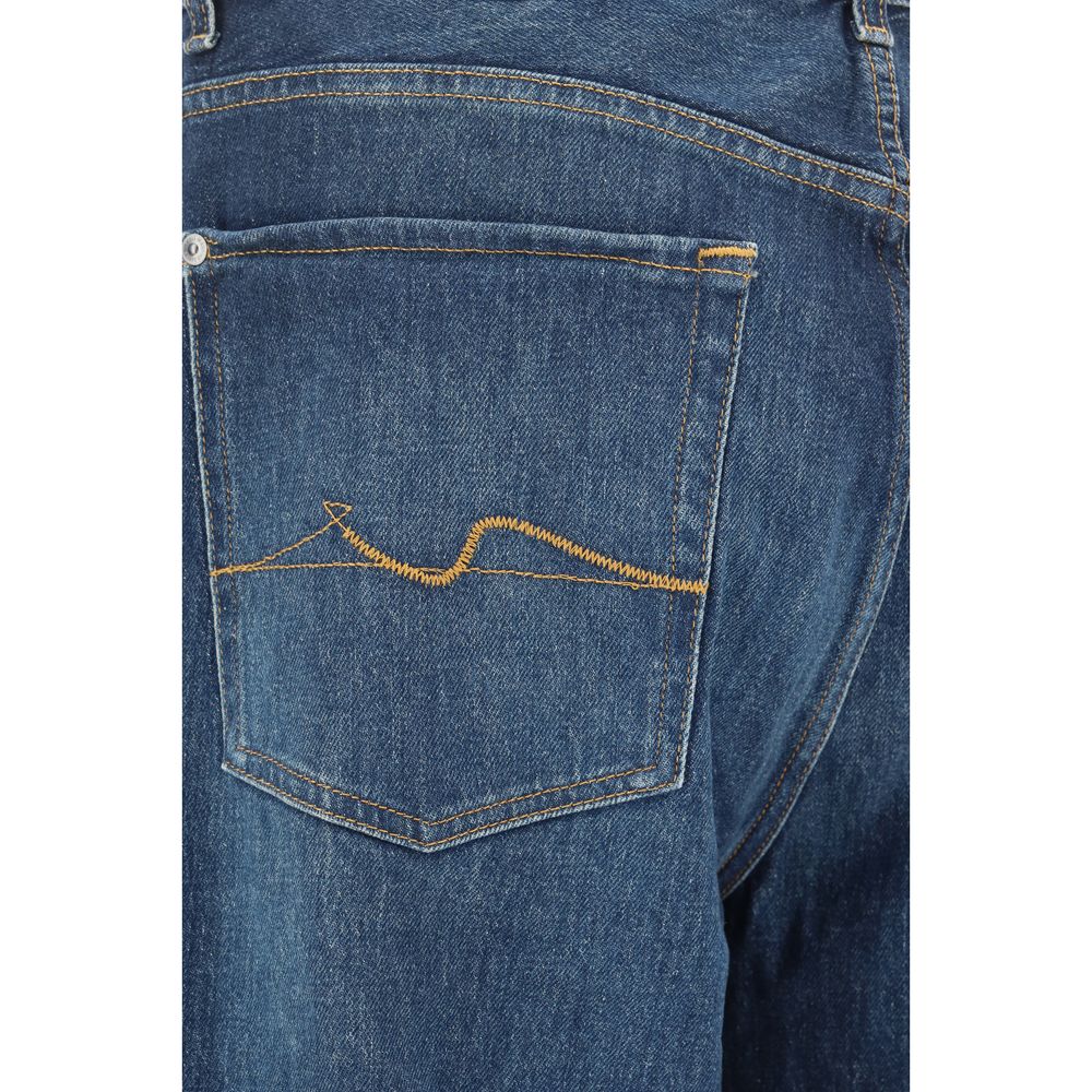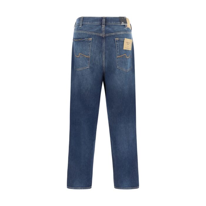 Cotton Ryan Threadlike Jeans by 7For, five-pocket styling, front button and zipper closure, waistband loops, iconic branded signature leather pressure-printed patch applied at back.
