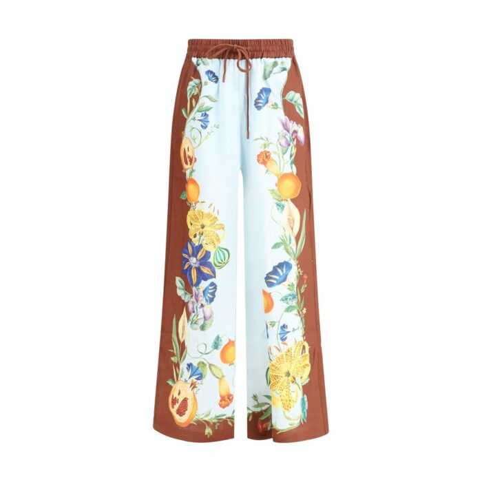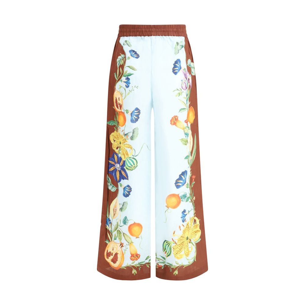 Dahlia Floral Pants by Alémais, wide-leg style, adjustable elasticated waistband with drawstring, two side welt pockets, multicolored alla-over print, regular fit.