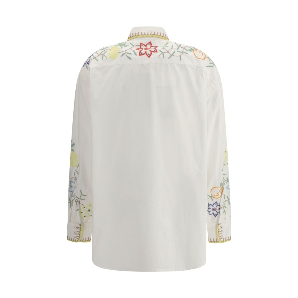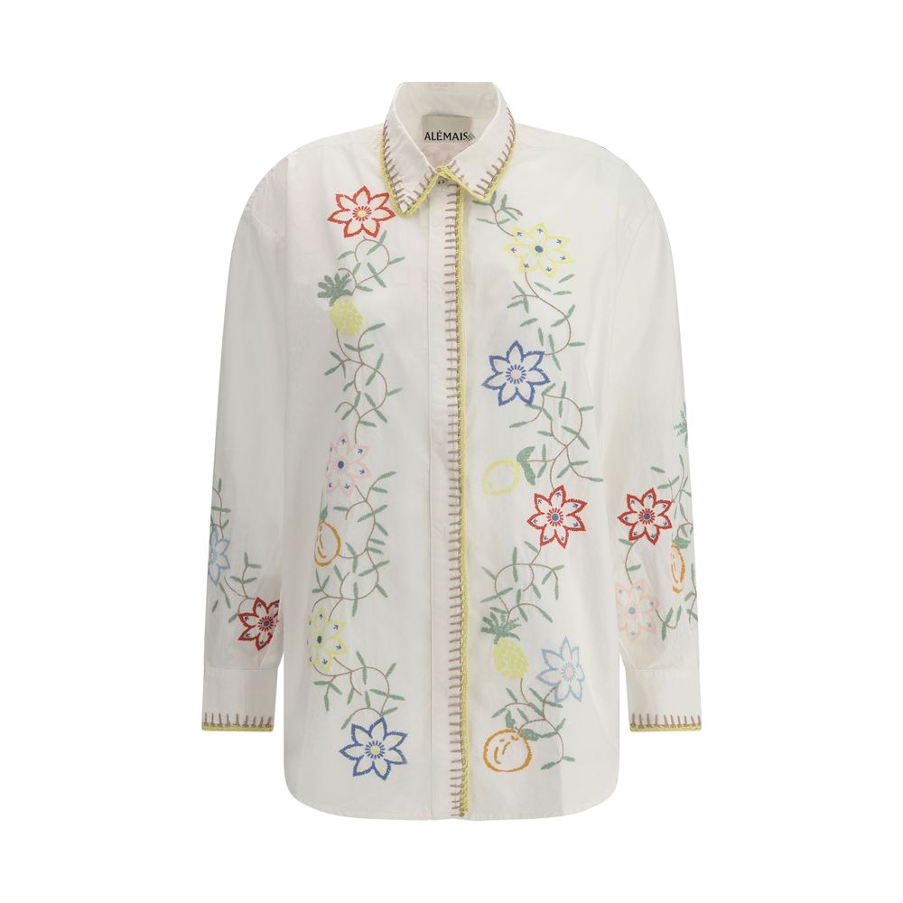 Cotton Olivia Shirt by Alémais featuring classic collar, button-front closure with front flap, adjustable button cuffs, multicolored flowers embroidered on front and sleeves, loose fit.