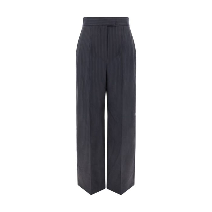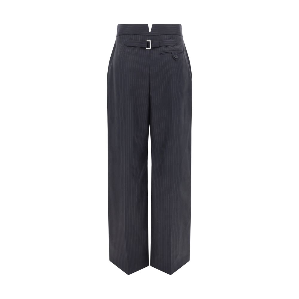 Wool Pants by Alexander McQueen, wide-leg style, pinstripe design, front button and zipper closure, two side slash pockets, welt pocket on back, adjustable martingale on back.