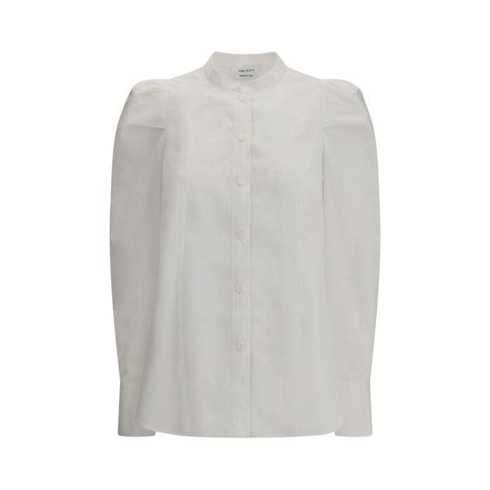 The White Alexander McQueen Shirt is crafted from 100% Cotton and features a mandarin collar, button closure, and ruffled shoulders, offering an elegant and feminine design with a contemporary edge.