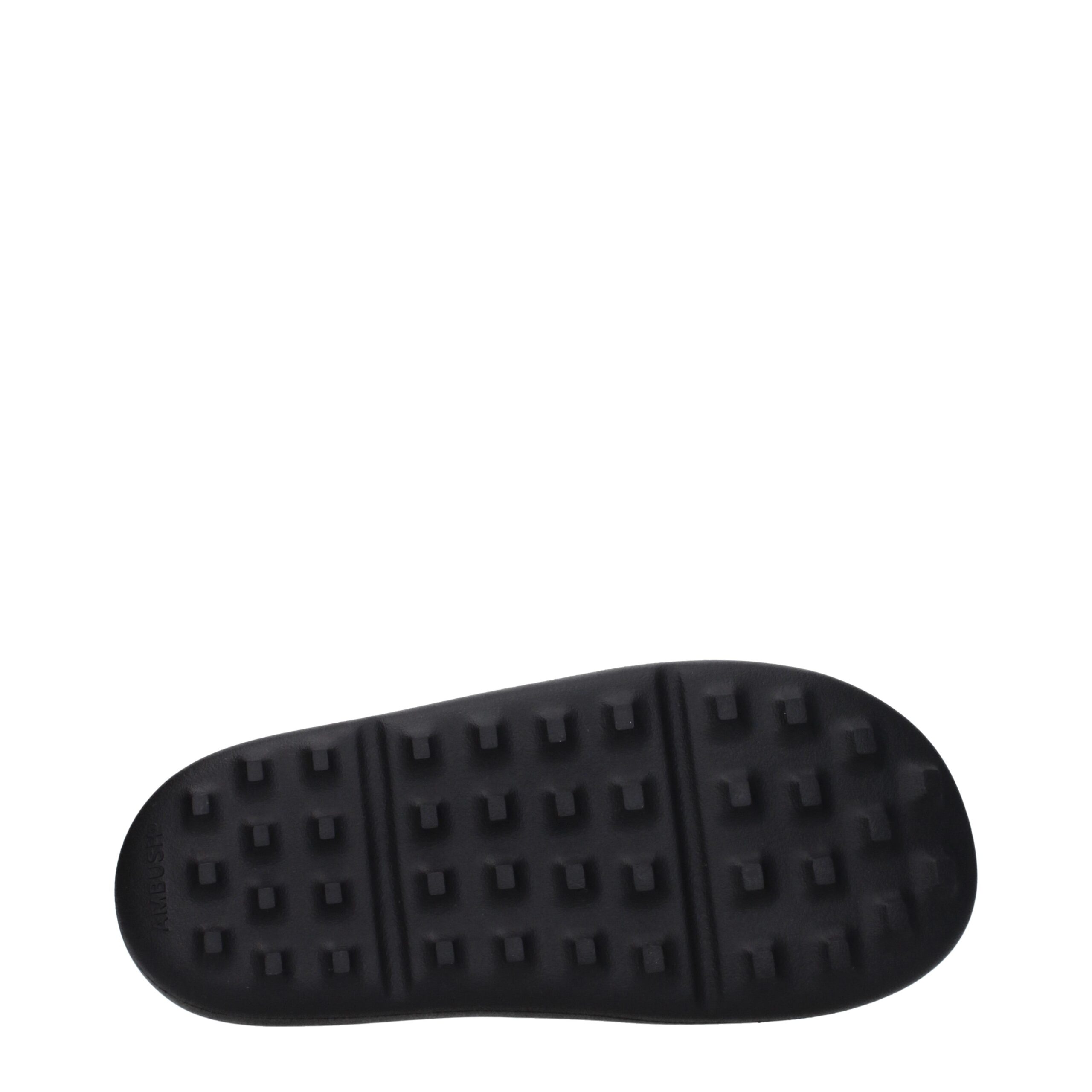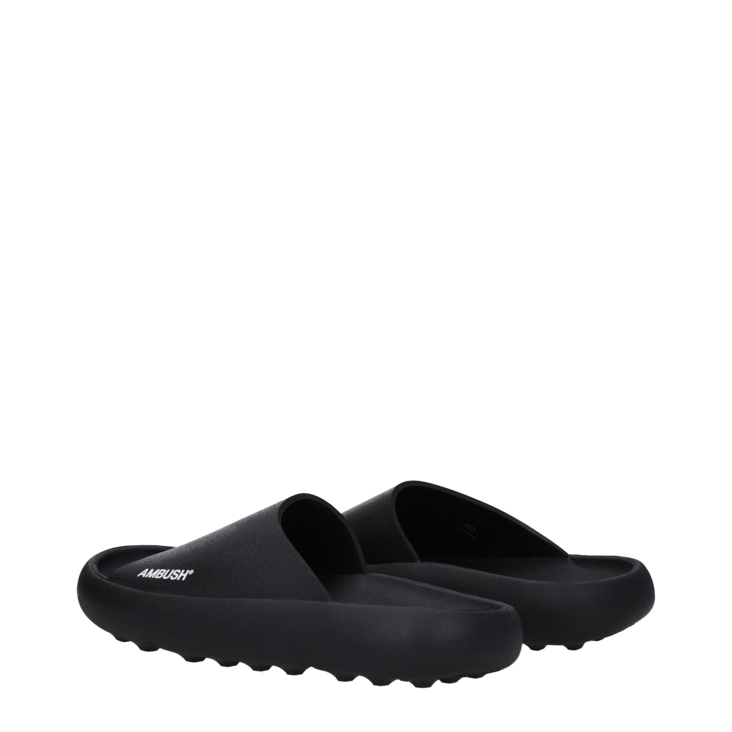 The product with MPN BMIC005MAT0011001 and code F79692 rubber in black is a slippers and clogs designed by Ambush. It has features like side logo.