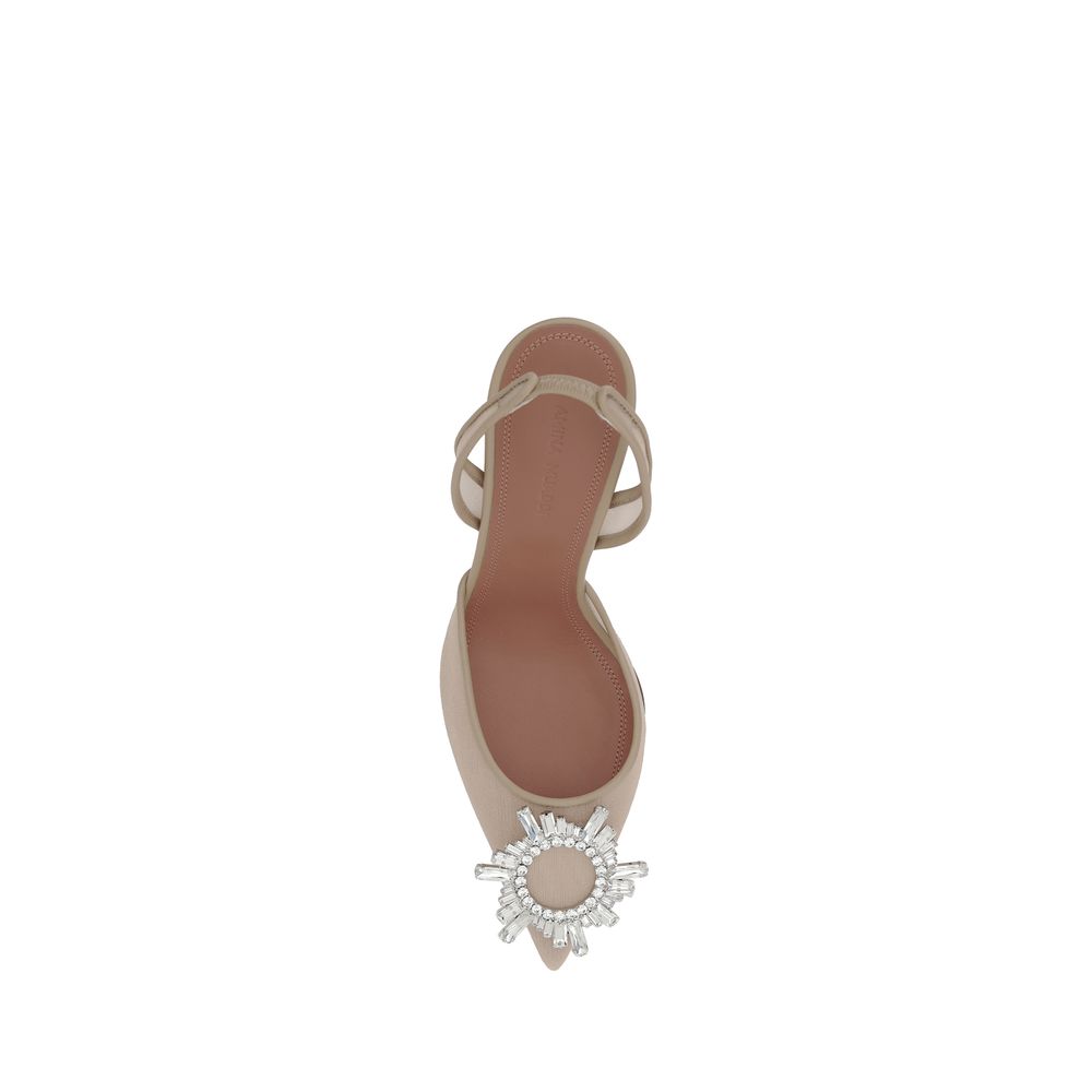 Begum Pumps by Amina Muaddi, a masterpiece of elegance and glamour. The elongated almond toe on the front gives a refined and sophisticated profile, while the geometric leather heel adds a modern and decisive touch. The slingback detail on the heel not only ensures a secure fit, but also adds an element of style. The rhinestone and diamond jewel applied in relief on the toe catches the light and enriches the design with a touch of sparkling luxury. The branded leather pressure insole offers comfort and an exclusive detail that perfectly completes the look.