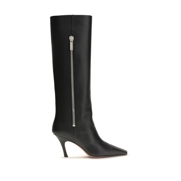 The Mona Boot 80 leather Boots by Amina Muaddi are a sophisticated and contemporary design, featuring the unmistakable 80 mm slanted heel that lends a modern, sculptural allure to the silhouette. Made of fine calfskin leather, they stand out for their clean lines, elegant structure and essential design that enhances any look. They also feature a practical external zippered pocket, a functional and distinctive detail that adds an urban touch to the model. A shoe with a strong character, perfect for completing both everyday and more sophisticated outfits.