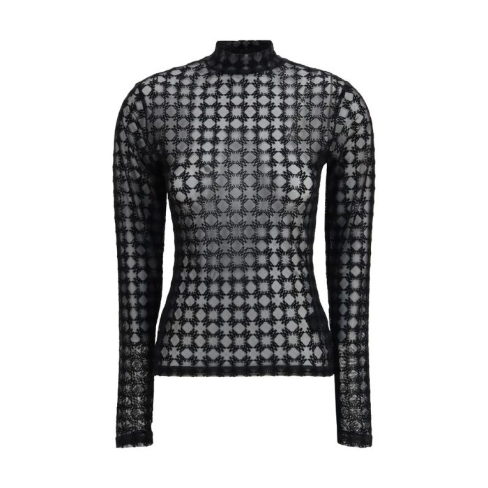 The semi-transparent Top by Amiri is a bold and sensual garment, featuring a fitted design with a high neckline. The transparent mesh fabric wraps around the body, creating a refined and seductive effect. Decorated with the brand’s distinctive motif, it adds a touch of exclusivity, while the small logo plaque on the back completes the look with an elegant and recognizable detail. A perfect top for those who want to combine style and sensuality in a single piece.
