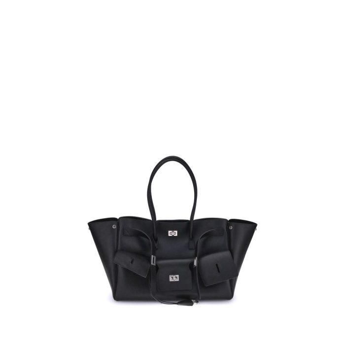 Balenciaga’s Bel Air medium Shoulder Bag is a spacious and functional accessory with a versatile pouch design. It features two handles for convenient carrying and the Balenciaga Paris logo embossed with silver lamination on the back, attesting to its authenticity. Enhanced with silver hardware and a removable key ring with double spiral loop, this bag is designed for organization: it includes snap buttons on the sides to modulate the shape, a swivel closure, and belts on the front with engraved logo. The interior features a large front pocket, an open main compartment, two interior zippered pockets and two interior flat pockets, offering practical solutions for every need.