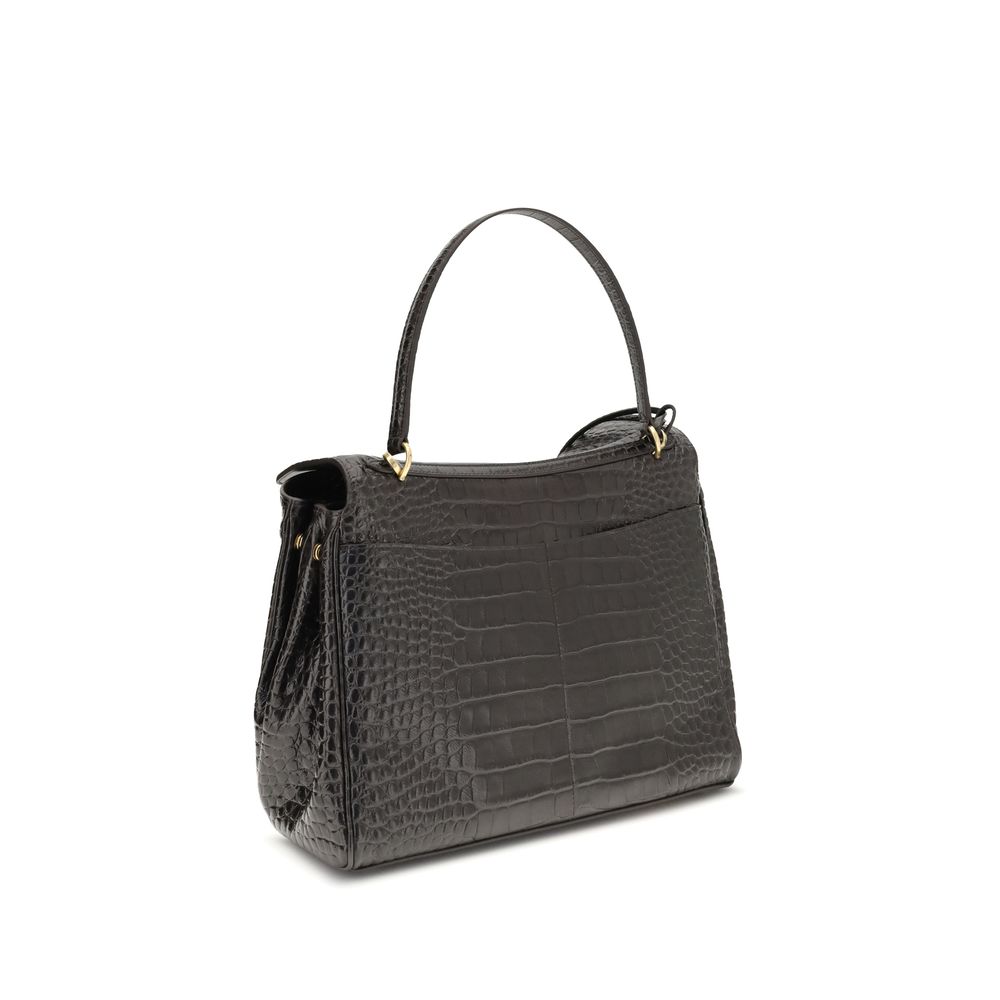 Leather Medium Rodeo Handbag by Balenciaga, single removable top handle, charm with key ring detail applied at base of handle, dual compartment, flap closure with swivel system at front, crocodile-effect leather design, double welt pocket on back panel.