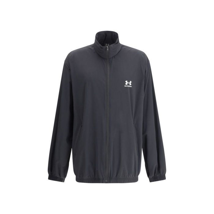 Jacket by Balenciaga, front zipper closure, collar with built-in hood, elasticized hem, elasticized sleeves, iconic brand monogram printed in contrast on front and back, monochrome pattern, oversize fit.