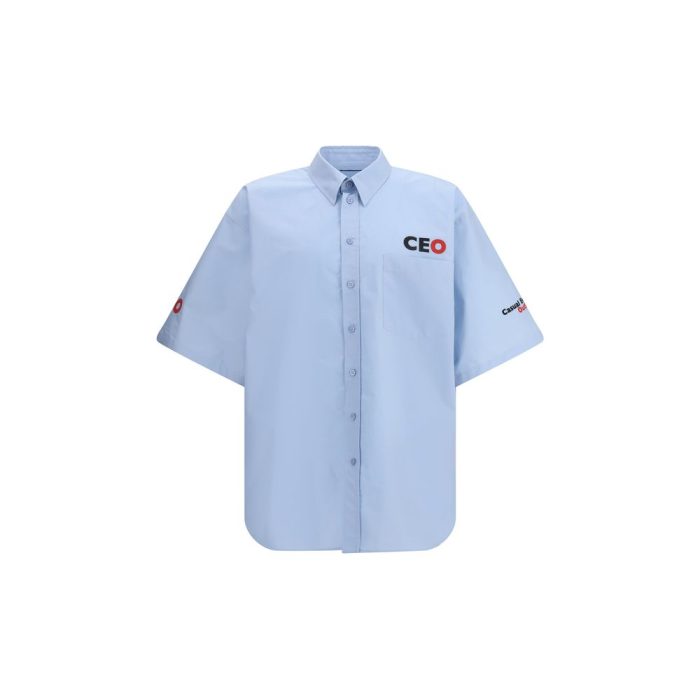 Cotton Shirt by Balenciaga features a classic collar and front button closure. The short-sleeved design features an applique welt pocket on the front, while contrasting embroidered “CEO” lettering on the sleeve and front adds a personal and modern touch. The oversized fit ensures comfort and contemporary style, perfect for a sharp, cutting-edge look.