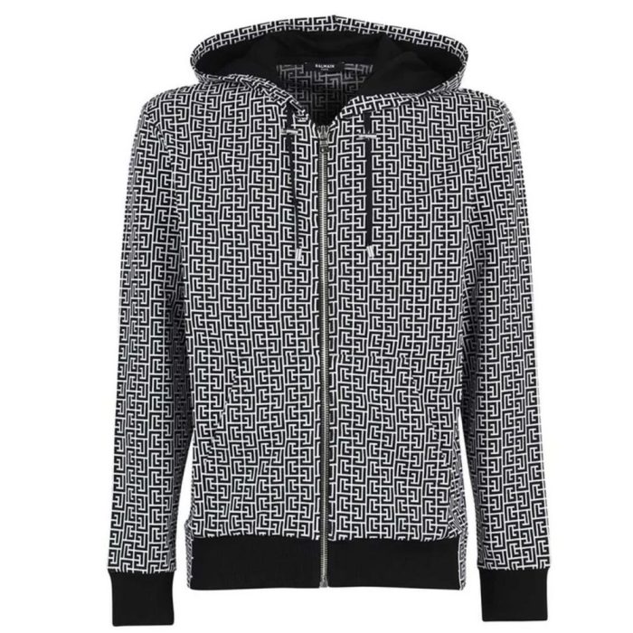 balmain, monogram hooded sweatshirt with drawstring, two front pockets design and zipper closure