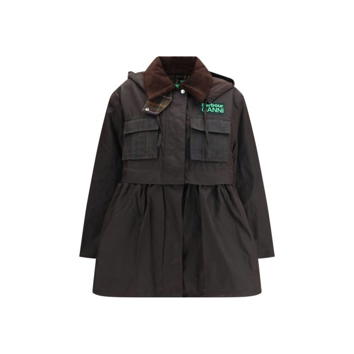 The waxed peplum Jacket by Barbour x GANNI blends British heritage with Scandinavian playfulness in a versatile, transformable design. The elongated silhouette features a detachable peplum skirt that zips off to reveal a shorter cropped shape, offering two looks in one. Barbour’s iconic waxed finish and tartan lining meet GANNI’s bold identity, highlighted by the dual-logo patch at the chest. A modern yet vintage-tinged piece, perfect for refreshing seasonal wardrobes with character and effortless style.
