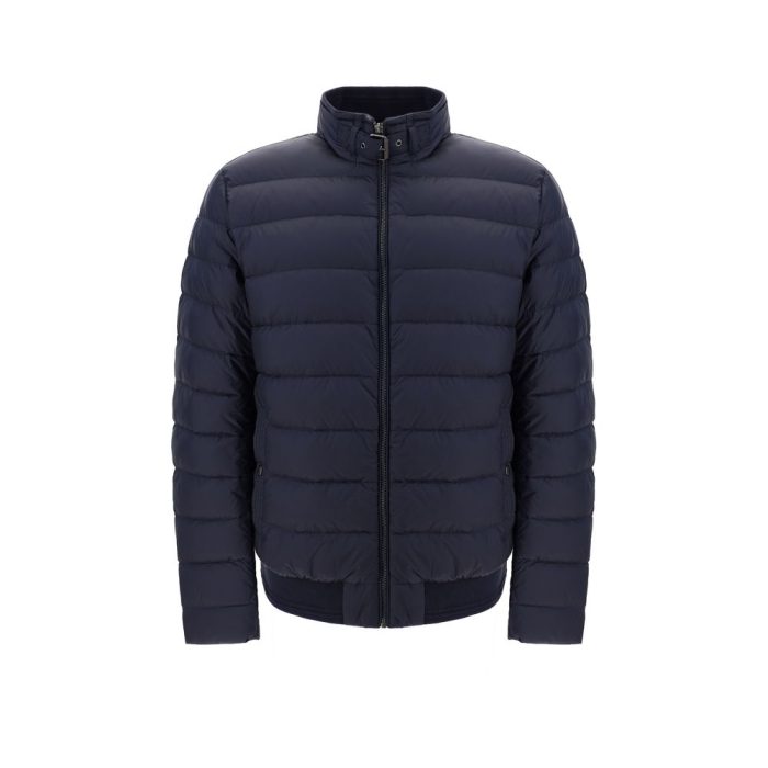 Circuit Down Jacket by Belstaff, high collar model adjustable with buckle, front closure by double-slider zipper, two welt pockets with side snap buttons, elasticated cuffs, elasticated ribbed hem, iconic brand monogram patch on left sleeve, monochrome pattern, regular fit.