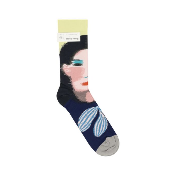 Cotton Face Canary Socks by Bonne Maison, mid-calf height, multicolored pattern.
