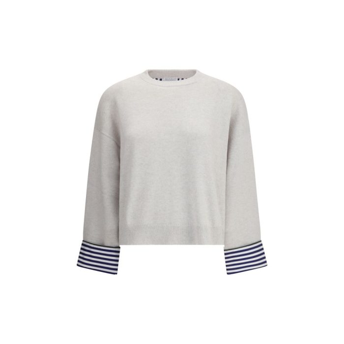 Brunello Cucinelli’s cashmere Sweater combines the softness of knitwear with refined tailoring details. Featuring a ribbed crew neck and hemline, it is distinguished by cuffs with a striped shirting fabric insert, embellished with iconic shiny jewels. A versatile and elegant garment that stylishly interprets the concept of understated luxury.