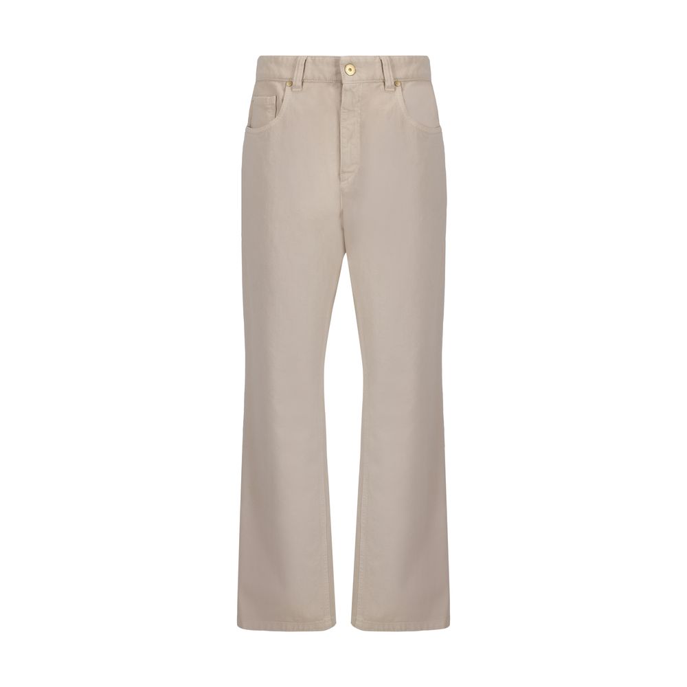 Cotton Denim Pants by Brunello Cucinelli featuring a straight five-pocket design, a front button and zipper closure, waistband loops, and an iconic branded leather signature pressure-printed patch applied to the back.