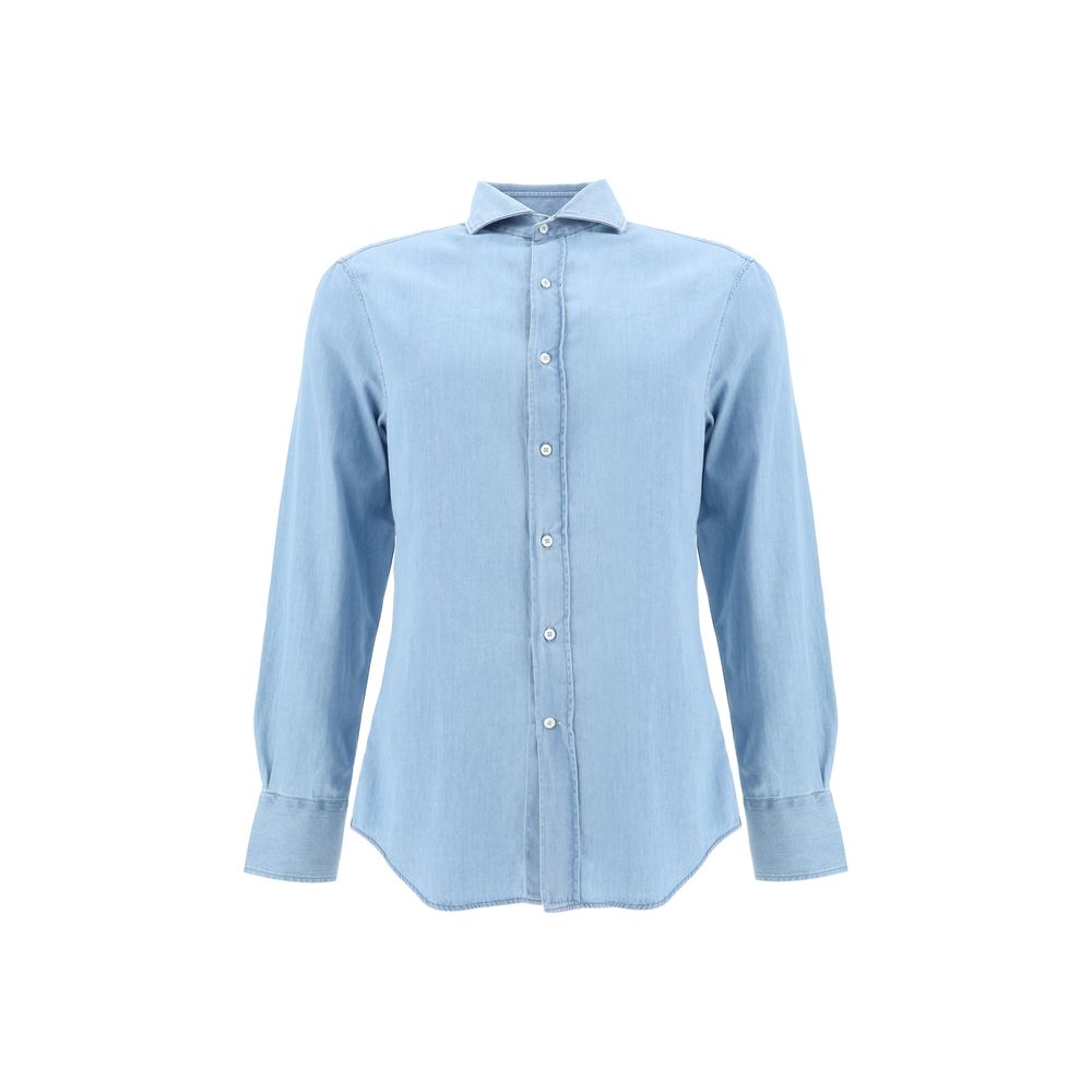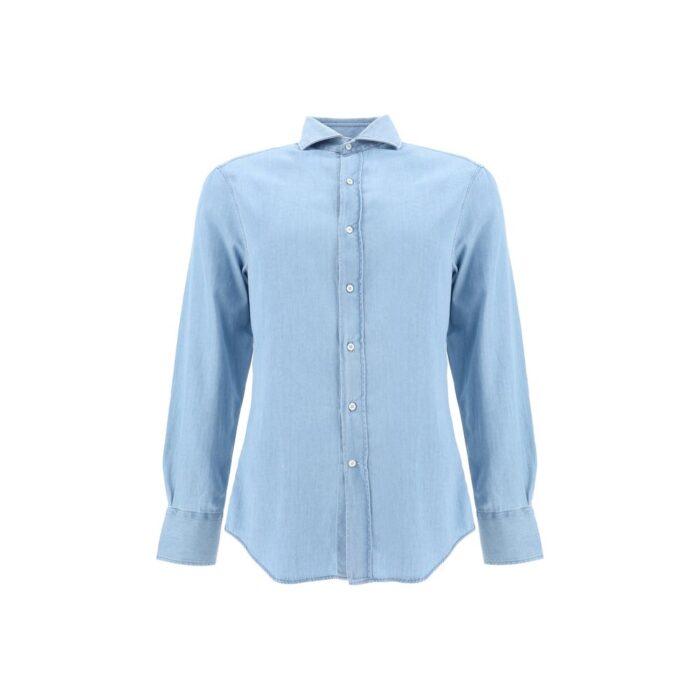 Denim Shirt by Brunello Cucinelli, featuring classic collar, front button closure, adjustable button cuffs, monochrome pattern, regular fit.