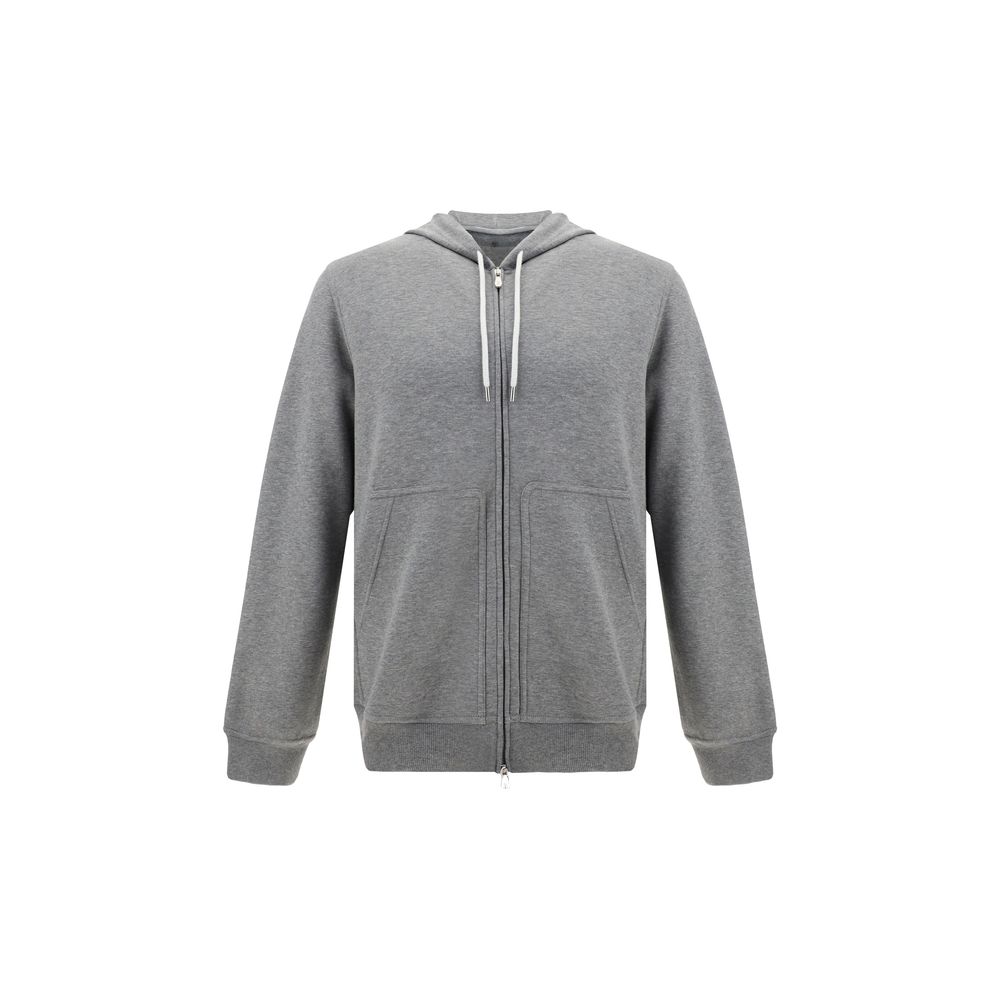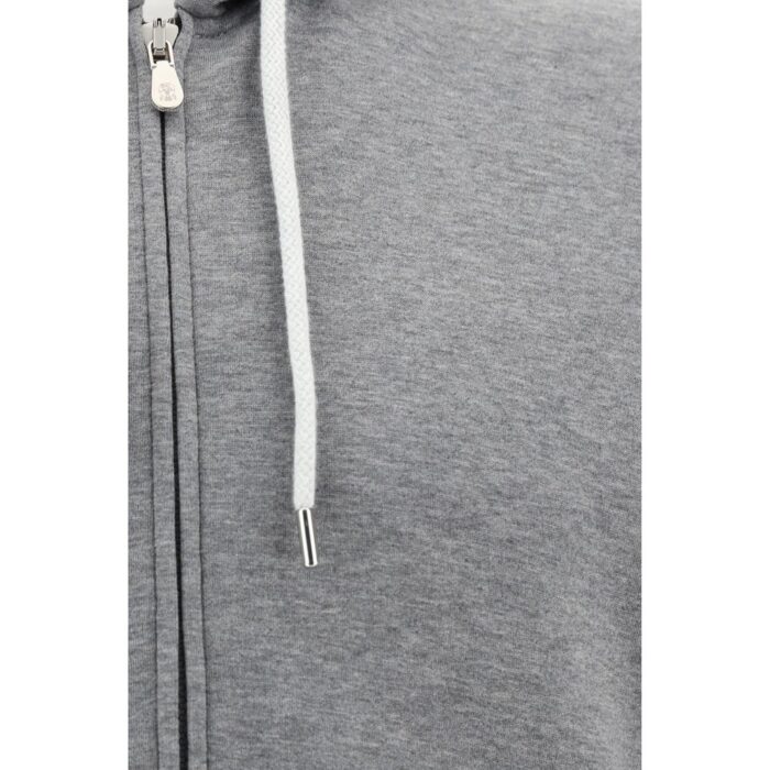 Cotton Hoodie by Brunello Cucinelli features hood with adjustable drawstring, two-way front zipper closure, two front patch welt pockets, ribbed cuffs, ribbed hem, monochrome pattern, regular fit.