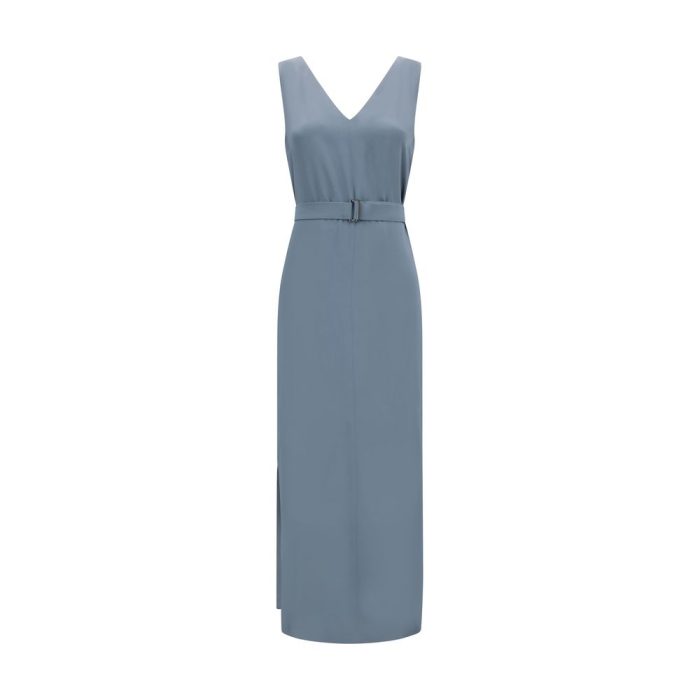 Brunello Cucinelli’s long Dress is an elegant and refined piece, featuring a sleeveless design with a V-neckline on both front and back. The bright jewel detail along the neckline adds a bright and distinctive touch, enhancing the lightness and fluidity of silk with discreet elegance.