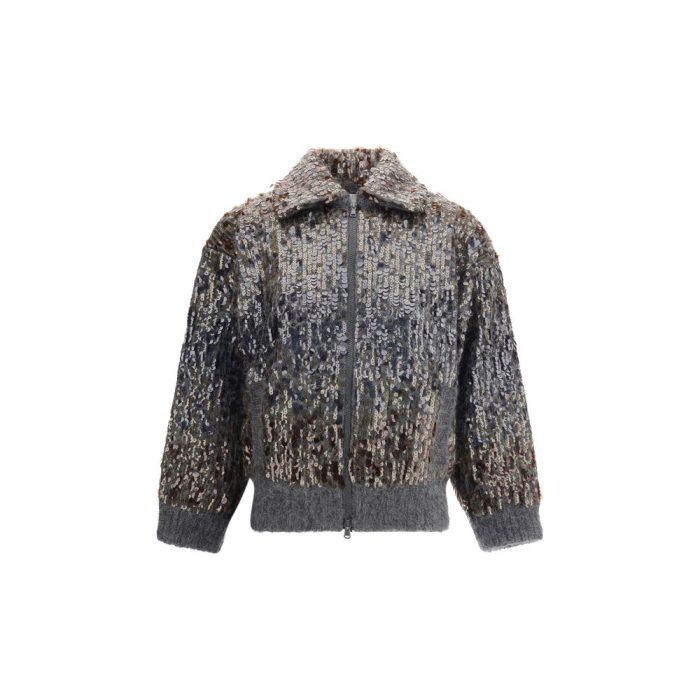 Brunello Cucinelli’s sequined Cardigan combines elegance and modernity. Crafted with shimmering details, it features a wide collar that lends character to the garment and a practical double-slider front zipper closure for a sophisticated yet versatile style..,
